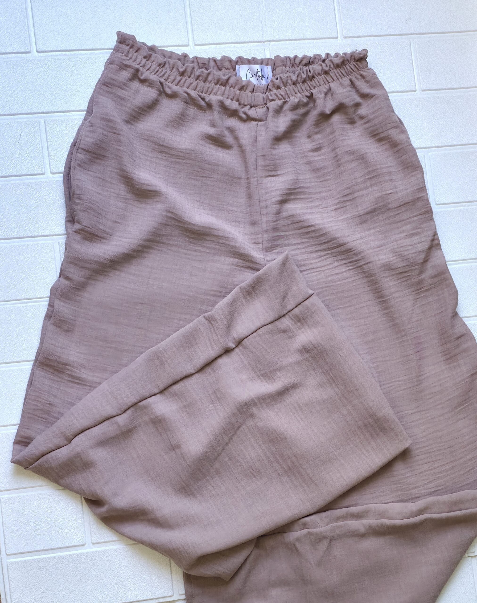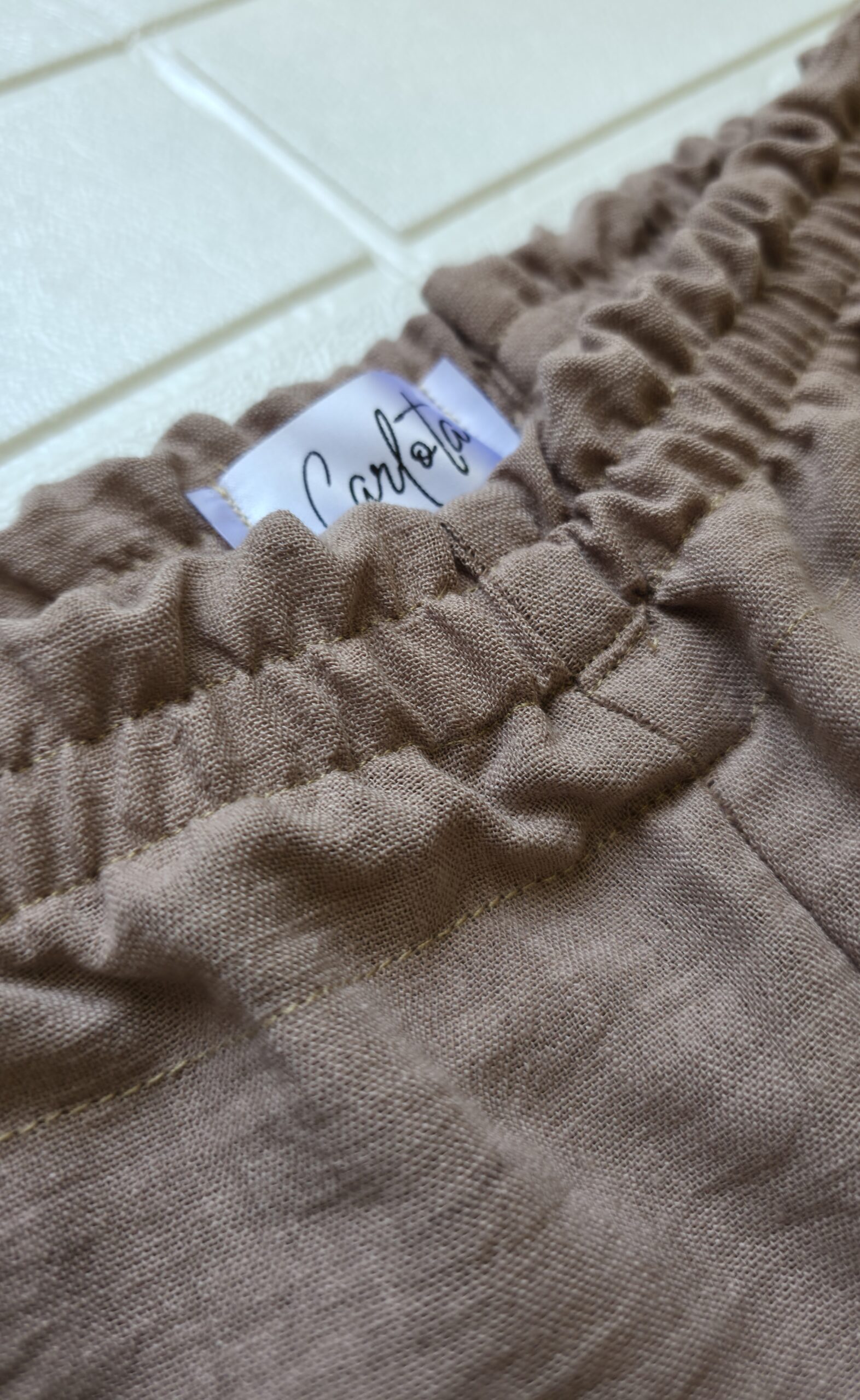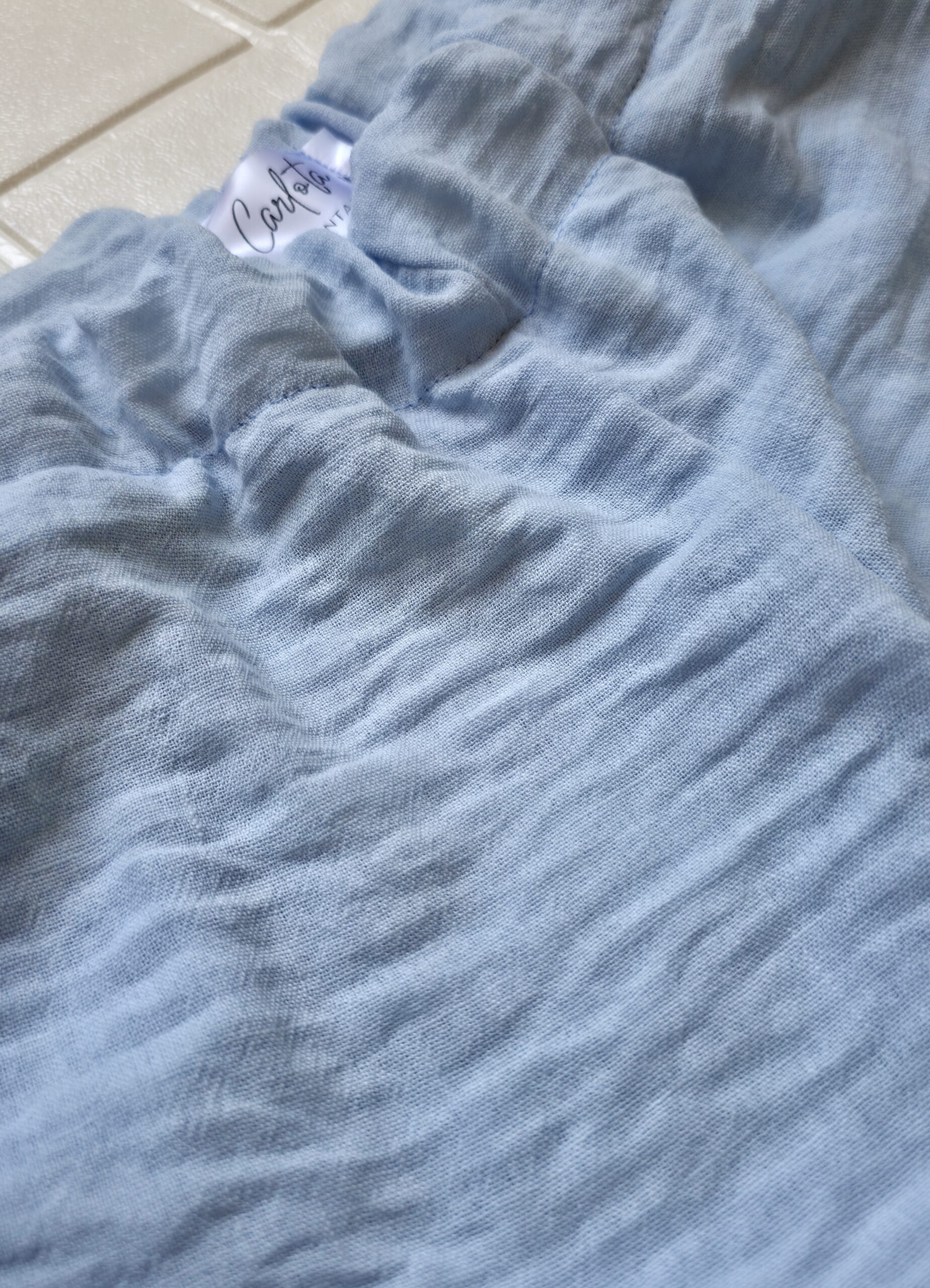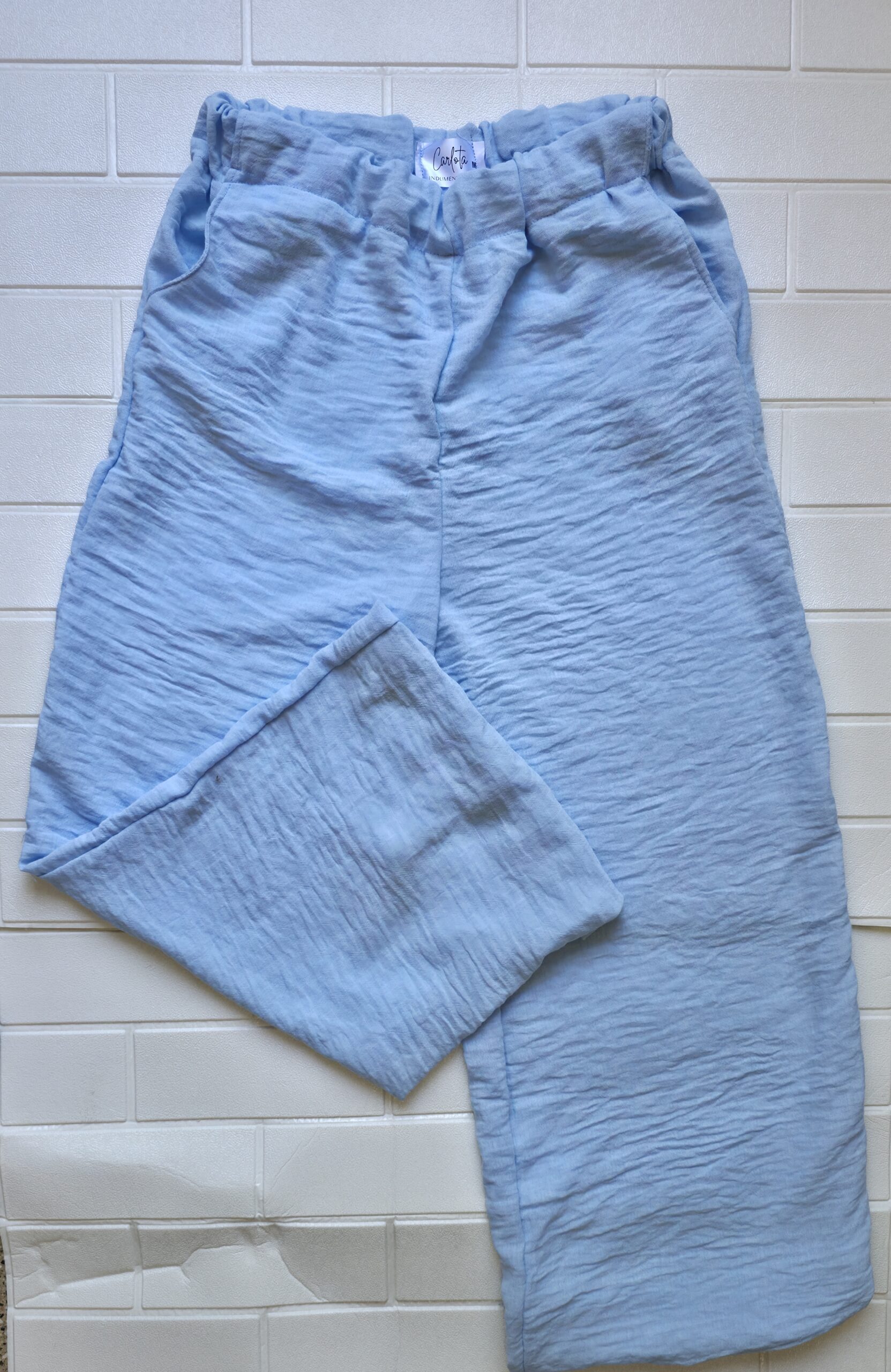 Pantalón de lino con bolsillos en beige y en celeste.